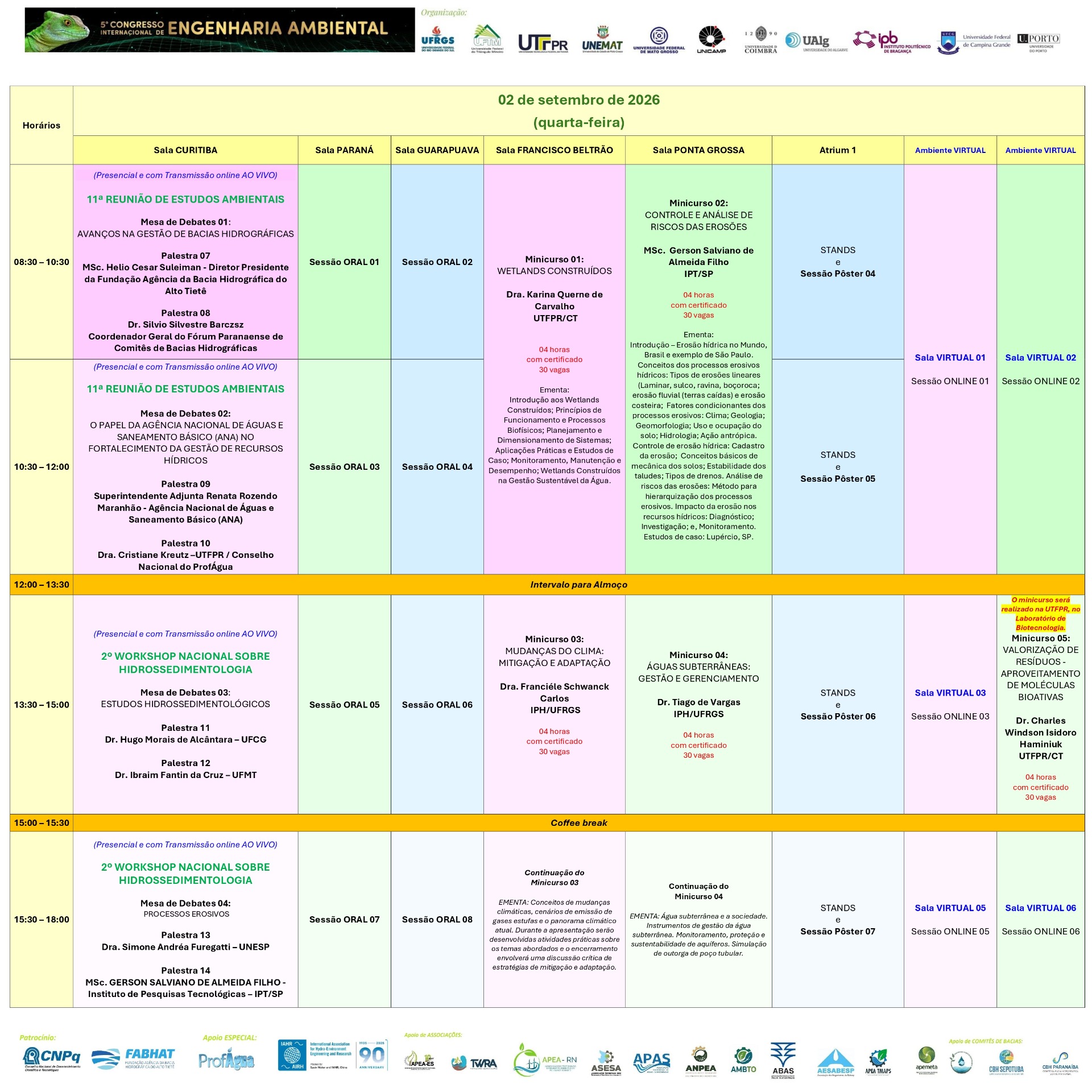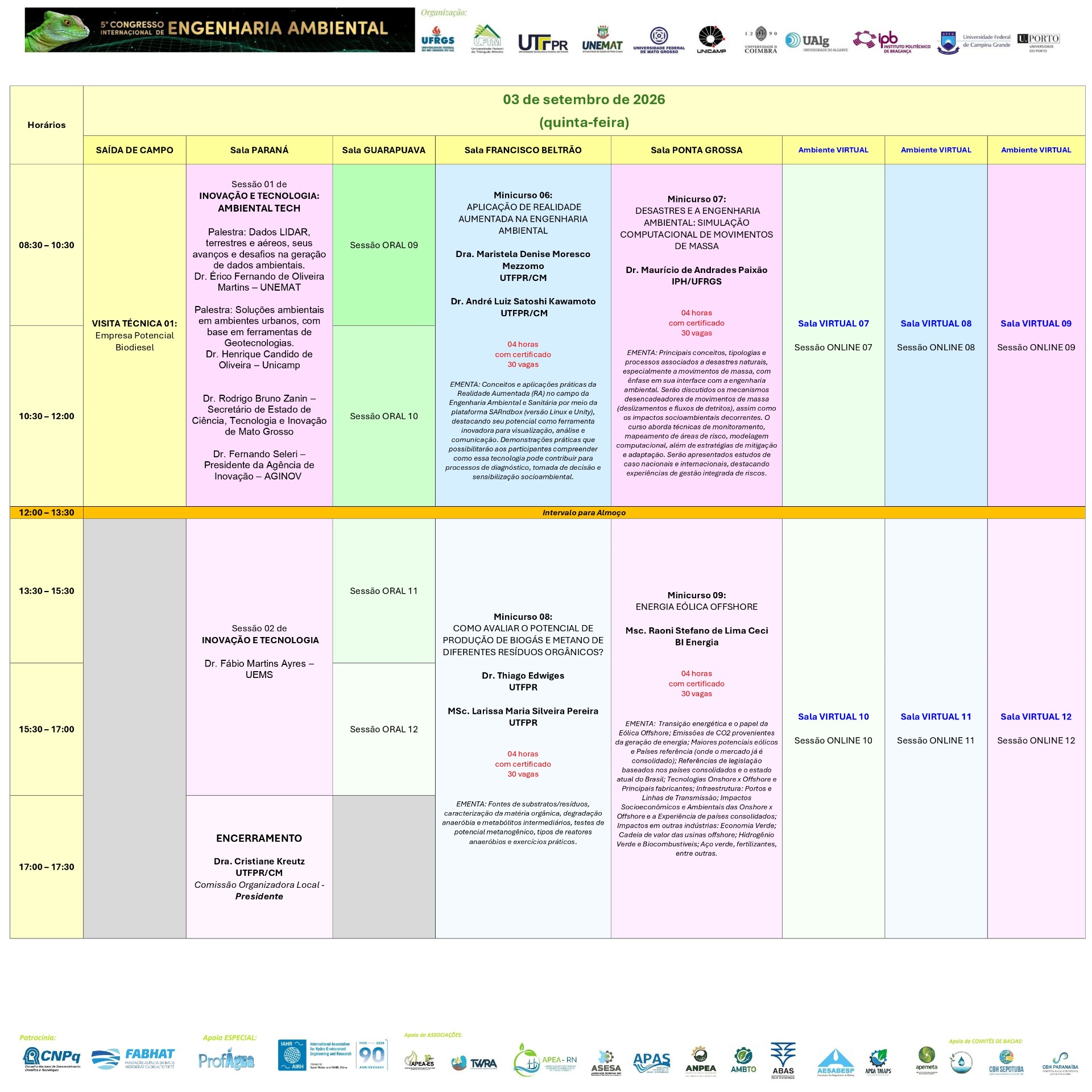 Ao longo de três dias intensos, serão oferecidas palestras de alto nível, mesas-redondas temáticas, painéis de pôsteres e workshops especializados, todos focados em tópicos cruciais como tecnologias de remediação de solos e águas, avaliação de riscos ambientais, energias renováveis, gestão de resíduos e governança socioambiental. Sob o tema Inovação, Resiliência e Sustentabilidade, o evento reúne engenheiros, ambientalistas, gestores públicos, consultores, empresas, estudantes de graduação e pós-graduação, promovendo networking qualificado e o intercâmbio de soluções integradas.
