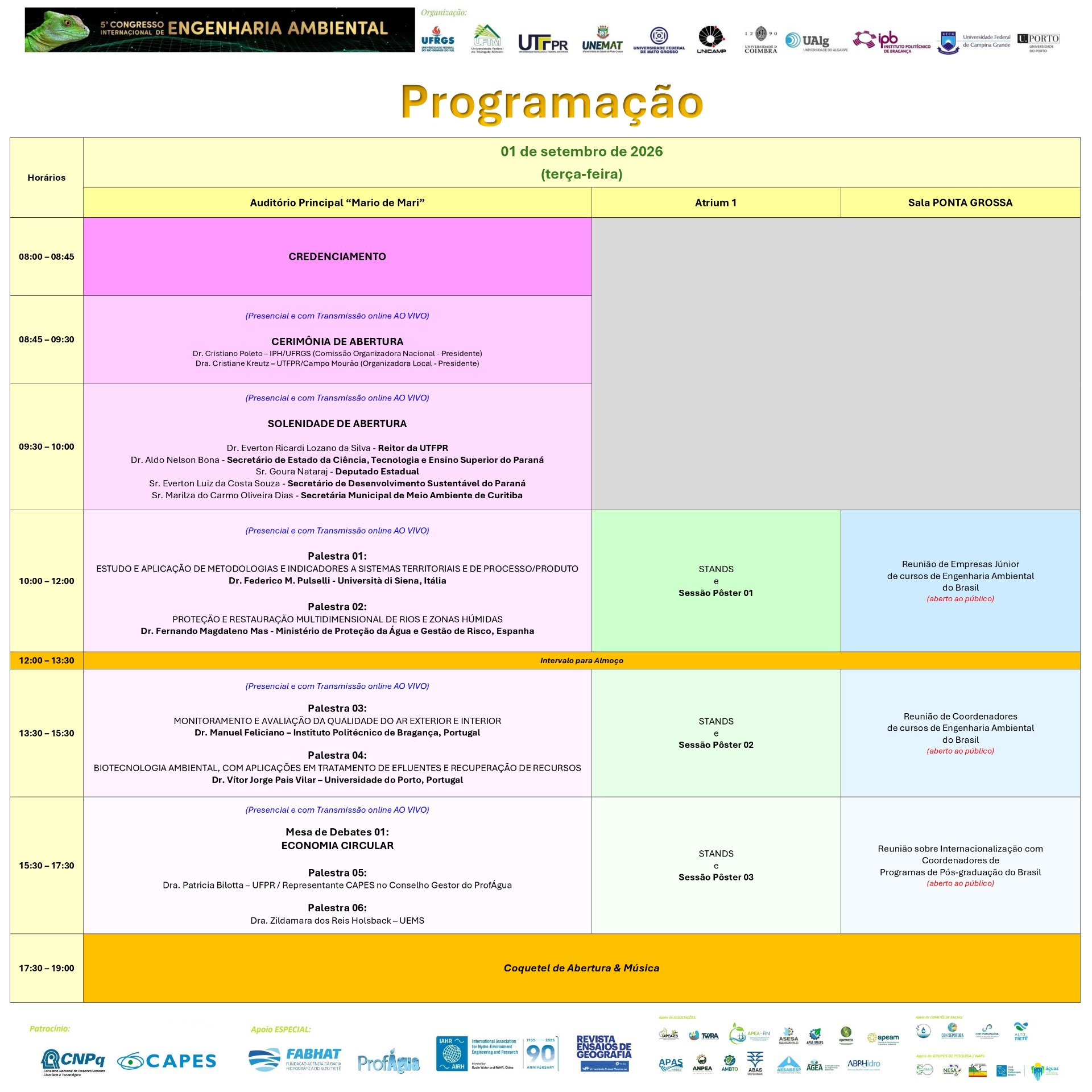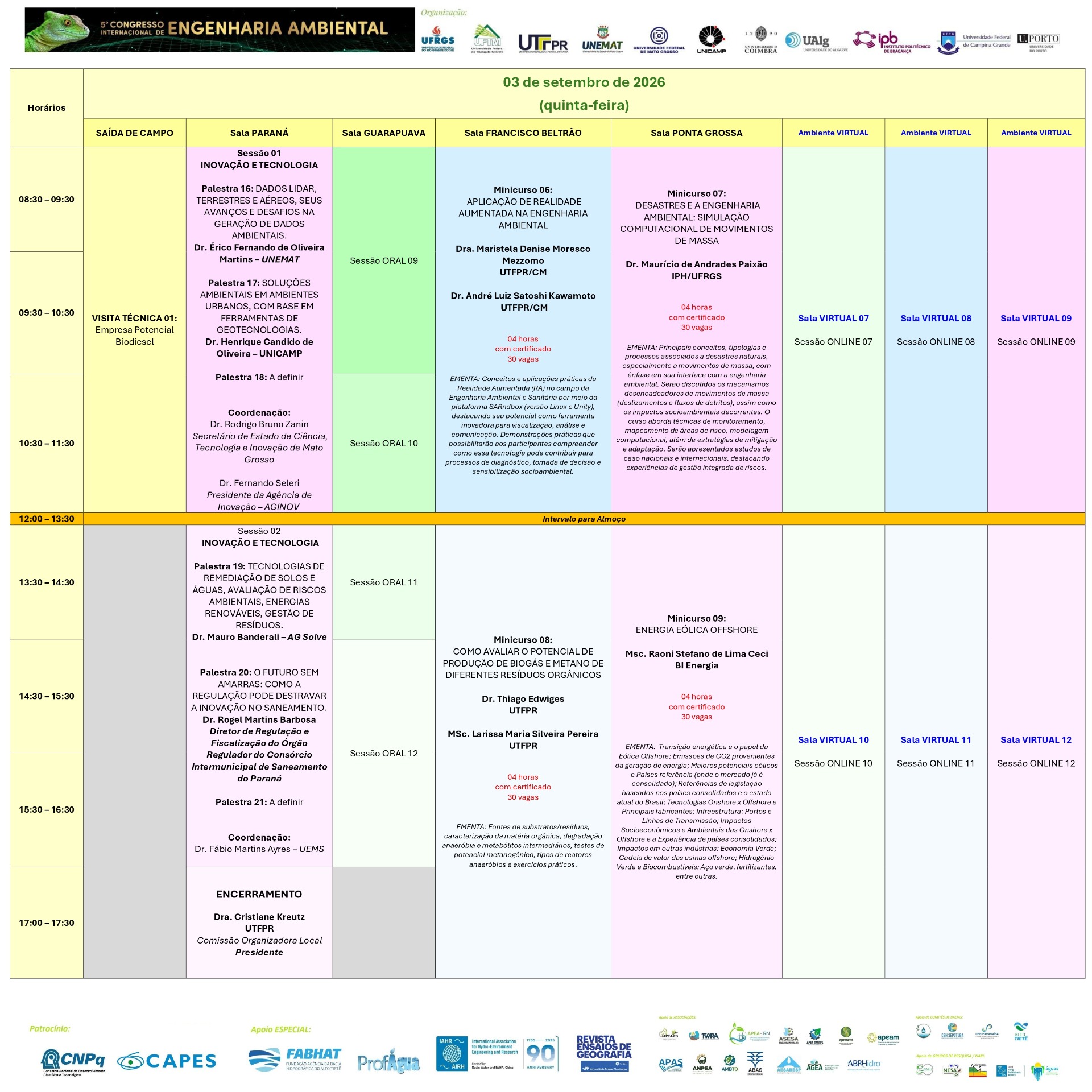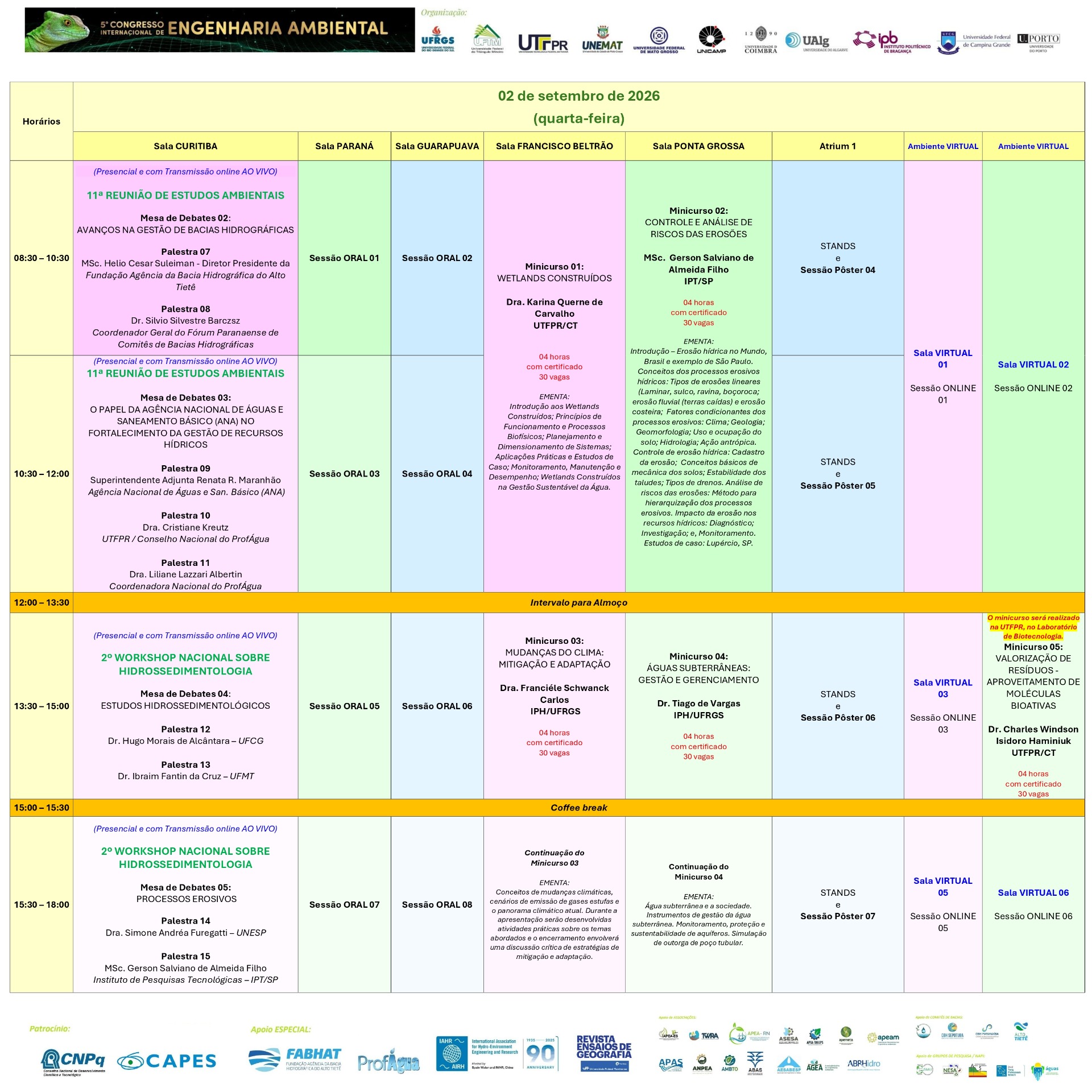 Ao longo de 03 dias intensos, serão oferecidas palestras de alto nível com 36 Palestrantes/Convidados, mesas-redondas temáticas, reuniões de PPGs e cursos de Engenharia Ambiental, painéis de pôsteres e workshops especializados, todos focados em tópicos cruciais como tecnologias de remediação de solos e águas, avaliação de riscos ambientais, energias renováveis, gestão de resíduos e governança socioambiental. Sob o tema Inovação, Resiliência e Sustentabilidade, o evento reúne engenheiros, ambientalistas, gestores públicos, consultores, empresas, estudantes de graduação e pós-graduação, promovendo networking qualificado e o intercâmbio de soluções integradas, além de uma Comissão Científica com 100 Pesquisadores.